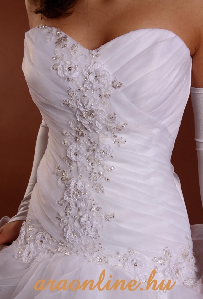 Szalonunkban csak vadonatúj esküvői ruhákat kínálunk eladásra. Áraink eladási árak, melyek tartalmazzák a ruhát, az abroncsot, egy alsószoknyát, és a menyasszonyi ruha méretre készítését/méretre igazítást. A menyasszonyi ruhát igény szerint elkészítjük fehér, csont vagy krém színben is. Mindegyik ruhánk kérhető uszályos változatban is, ennek feláráról kérem, érdeklődjön elérhetőségeinken. Ízlés szerint az alapanyagok, díszítések megváltoztathatóak. A ruha felsőrésze kérhető cipzár-fűző vagy V-betétes –fűzős variációban is. Ha teheti, keressen fel minket személyesen is, szívesen segítünk a megfelelő menyasszonyi ruha, a legideálisabb fazon és a legtökéletesebb esküvői kiegészítők megtalálásában. Saját modelljeink mellett bármilyen egyéni elképzelést is megvalósítunk.
